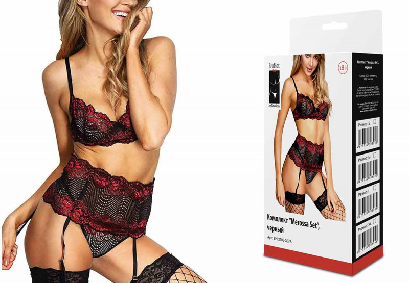 Сексуальный комплект белья из черно-красного кружева с цветочным узором. Добавьте чувственные чулки и – невероятно горячий вид гарантирован!